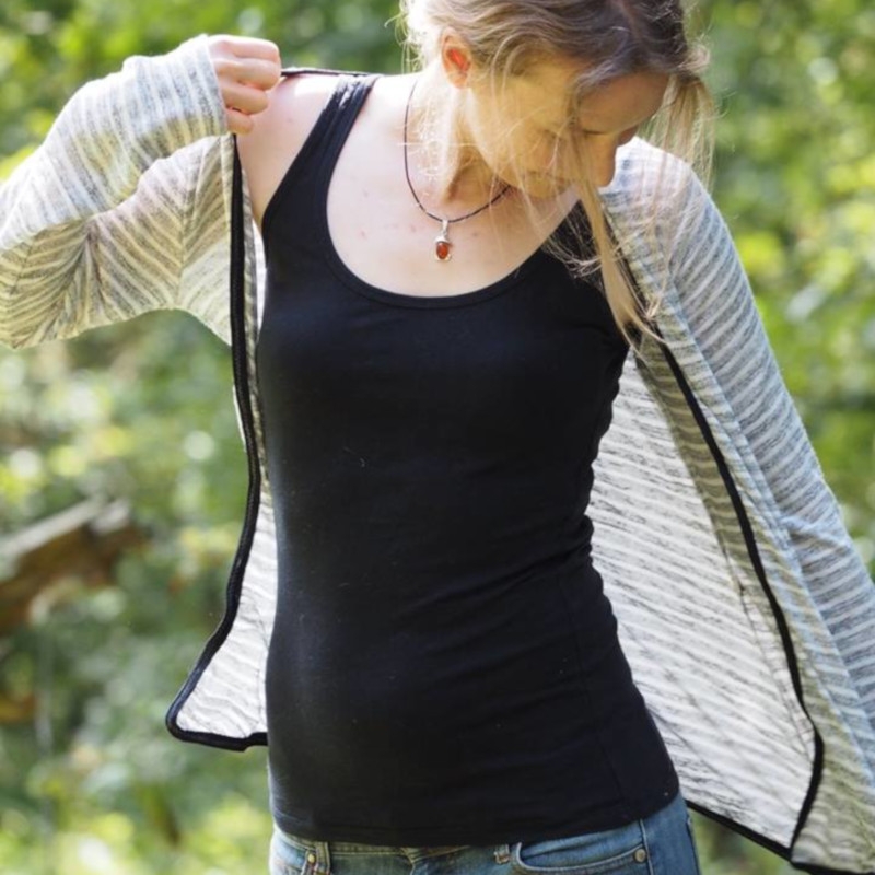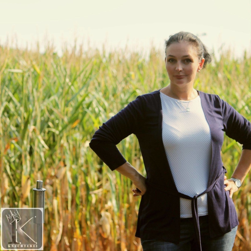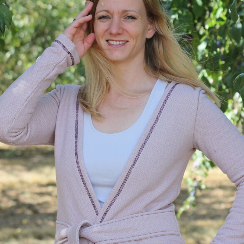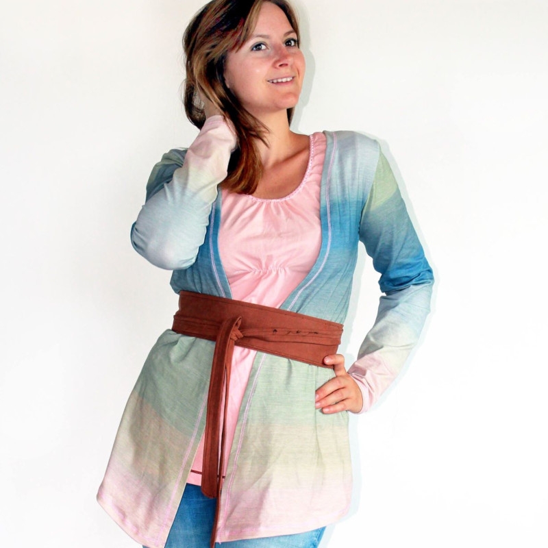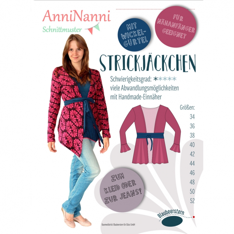 Das AnniNanni "Strickjäckchen" ist ein einfach zu nähender Schnitt für eine offen getragene Strickjacke. Wahlweise kann das Jäckchen mit einem Wickelgürtel, der ebenfalls im Schnittmuster enthalten ist, in der Taille gebunden werden oder offen und frei hängend getragen werden. So wirkt es entweder schick oder lässig und kann zum Kleid ebenso kombiniert werden wie zur Jeans.