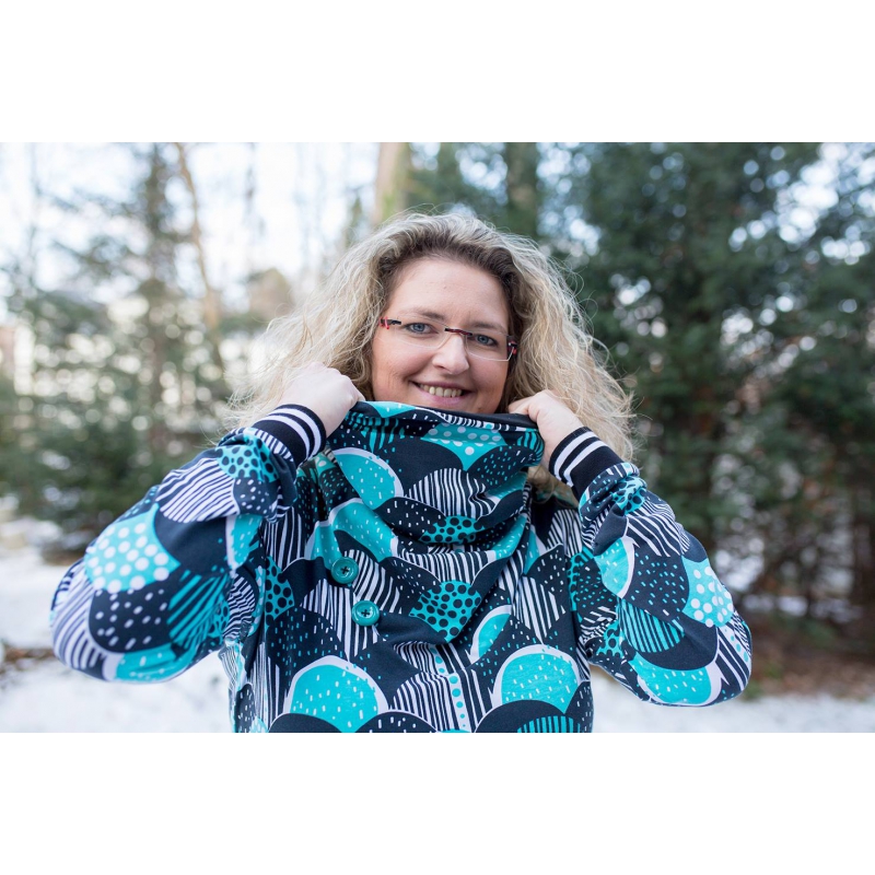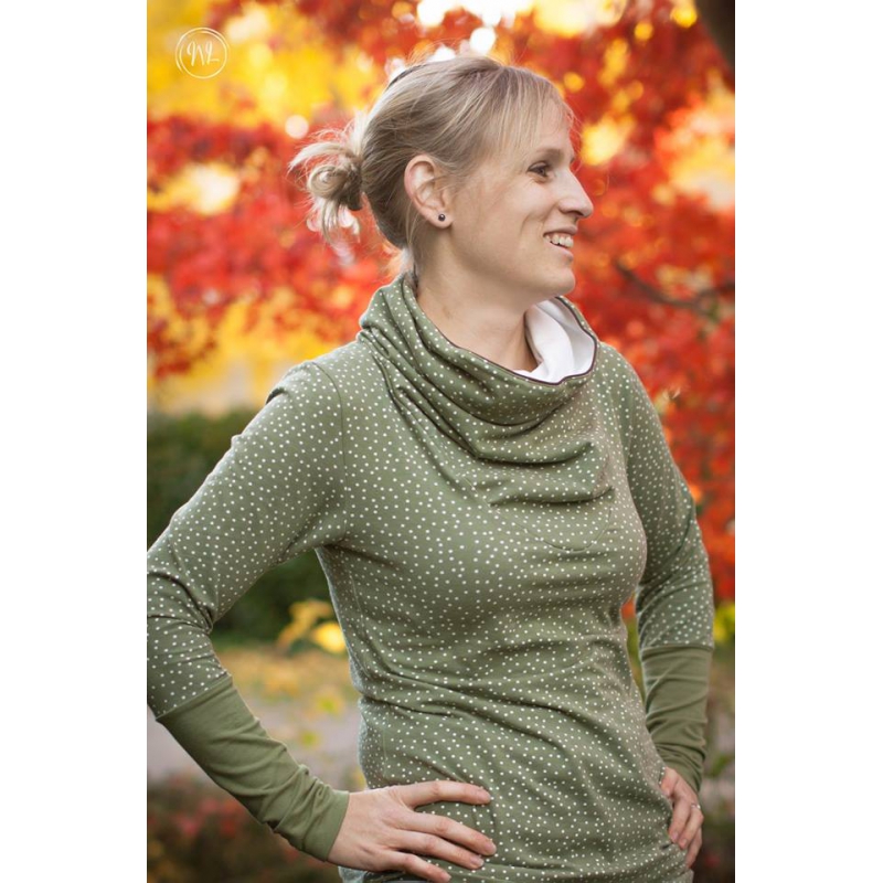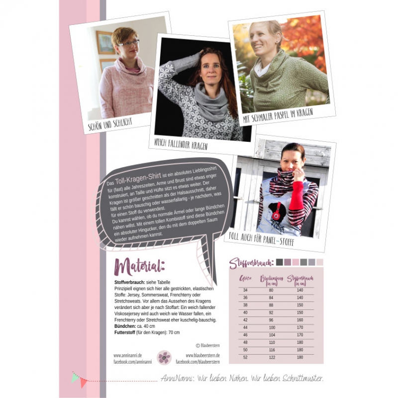 Das "Toll-Kragen-Shirt" ist ein absolutes Lieblingsshirt für (fast) alle Jahreszeiten. Arme und Brust sind etwas enger konstruiert, an Taille und Hüfte sitzt es etwas weiter. Der Kragen ist größer geschnitten als der Halsausschnitt, daher fällt er schön bauschig oder wasserfallartig - je nachdem, was für ein Stoff verwendet wird.